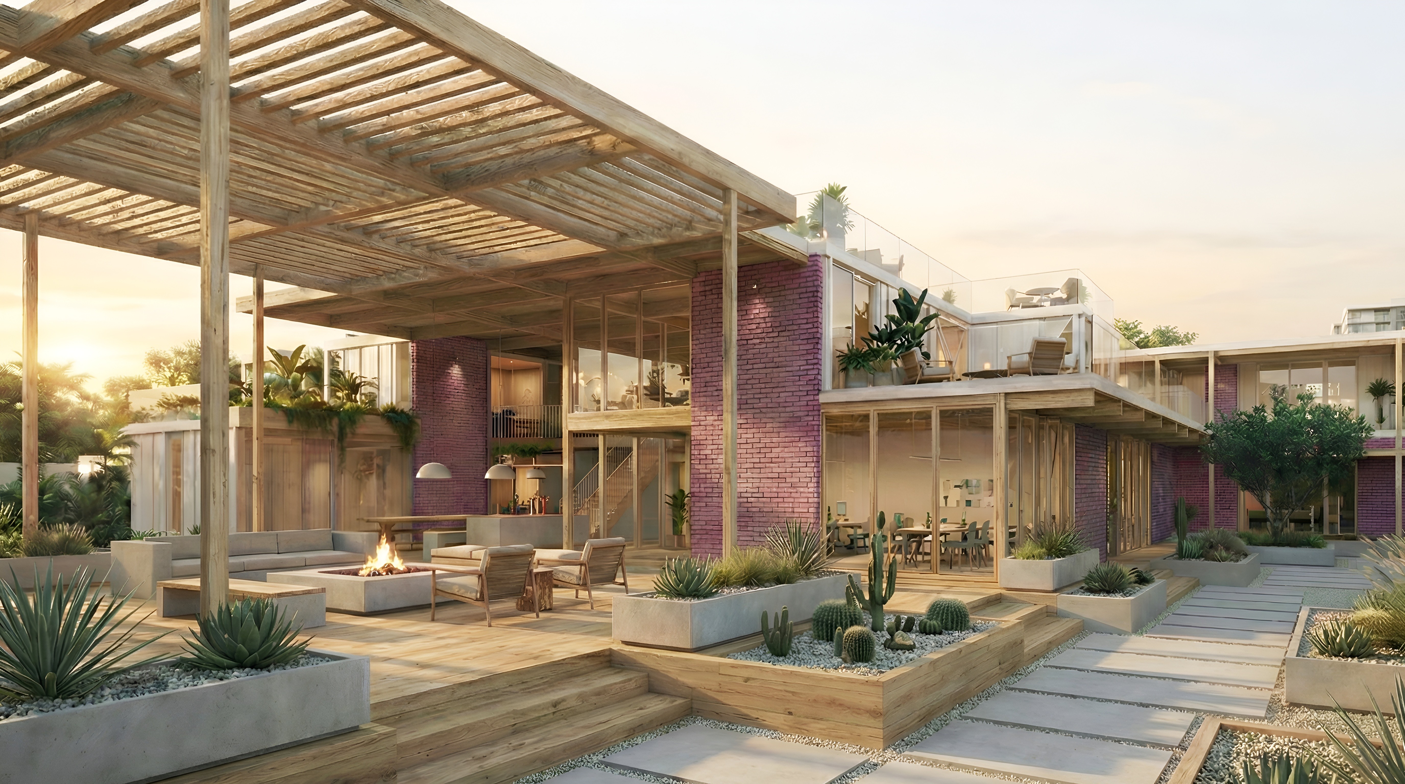 Material choices are restrained and site-responsive: timber elements, mineral-based surfaces, and untreated structural systems are assembled to weather, bleach, and age alongside the ceramic processes they host. Construction tolerances remain intentionally legible, reinforcing a dialogue between precision and imperfection intrinsic to ceramic production. Landscape intervention is minimal, relying on ground leveling, retaining edges, and planted clearings integrated with existing vegetation—palms, cultivated trees, and low ground cover—rather than formalized gardens.