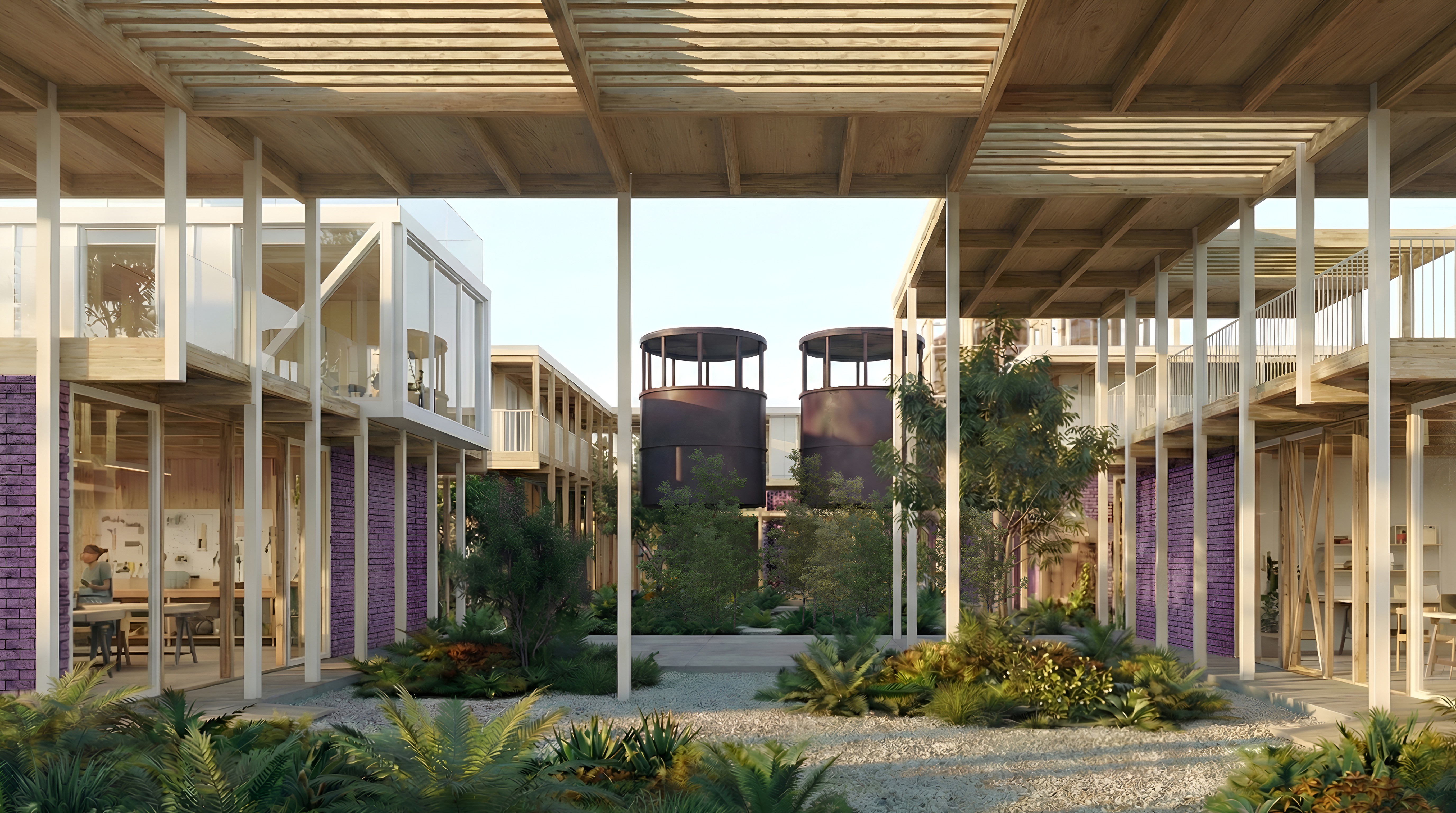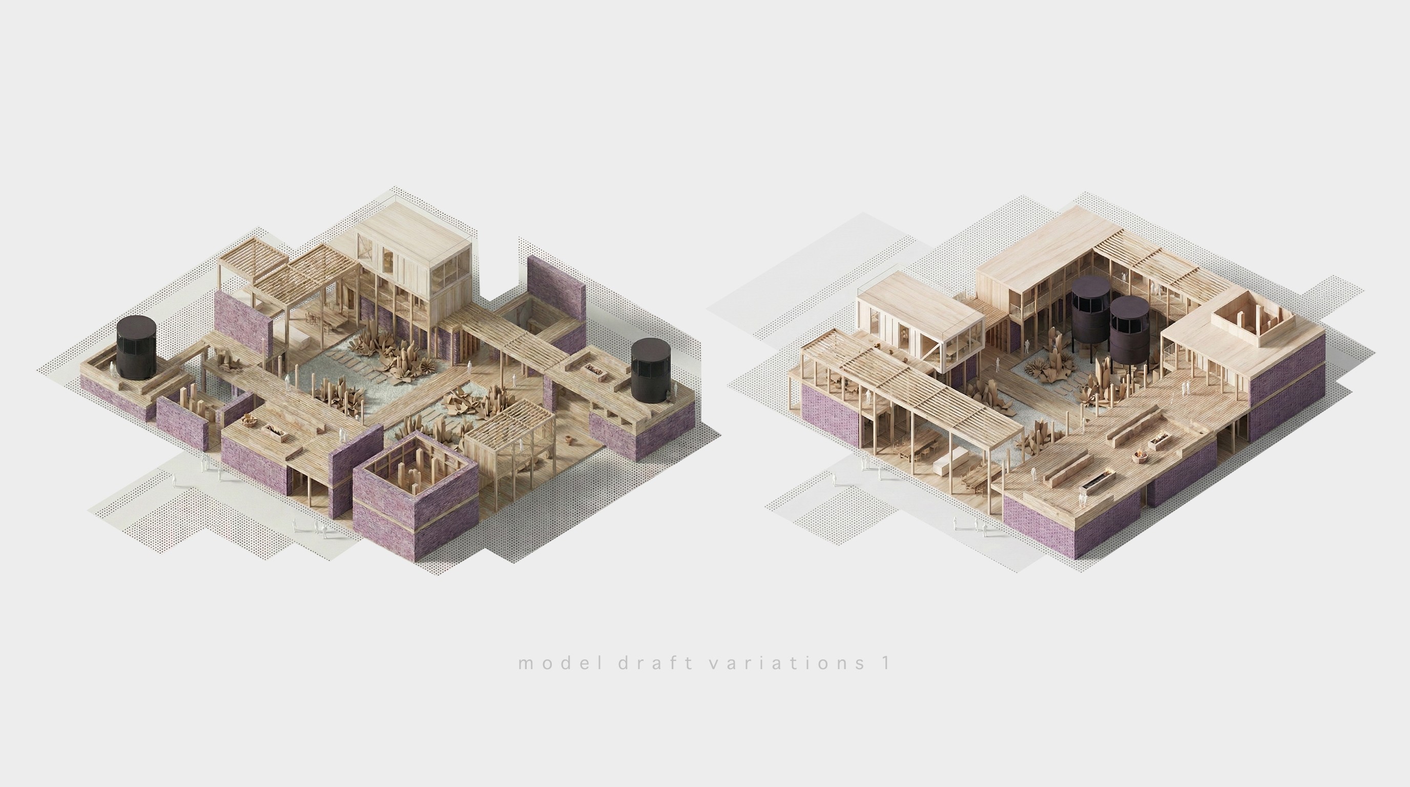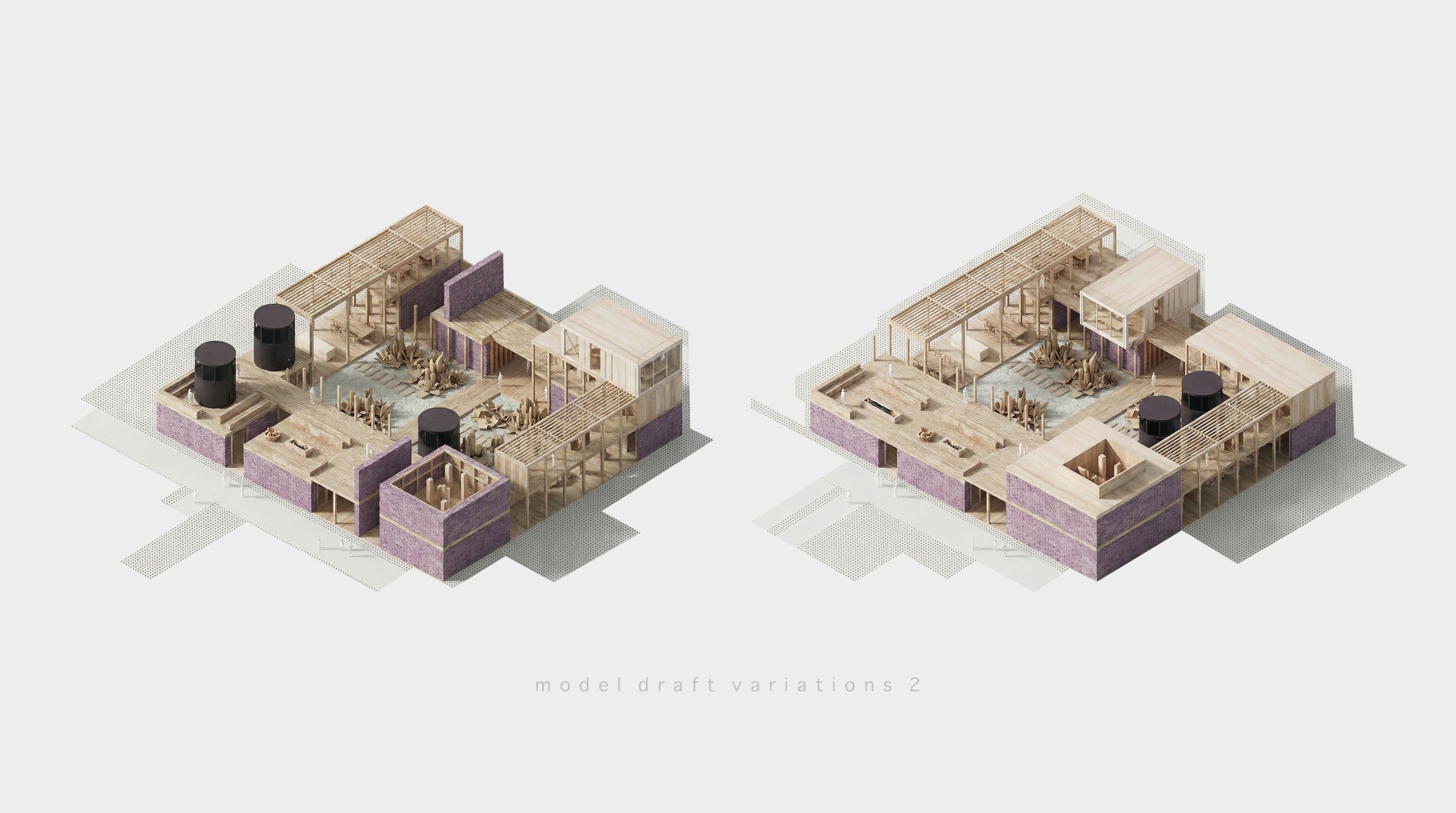Beyond its production role, the center establishes a calibrated interface between work, dwelling, and reflection without formalizing a residential program. Short-stay maker rooms, tool-maintenance bays, and shared hearth spaces are embedded at the edges of the working field, allowing prolonged engagement with the site while preserving its calmness. Light is treated as a working instrument—filtered, lateral, and heat-aware—entering through deep reveals, shaded clerestories, and partially open roofs to register daily and seasonal shifts. As a result, the architecture does not frame production as an event to be observed, but as a continuous condition to be inhabited, reinforcing Kaledran’s character as a place where making, waiting, and transformation unfold at their own pace.