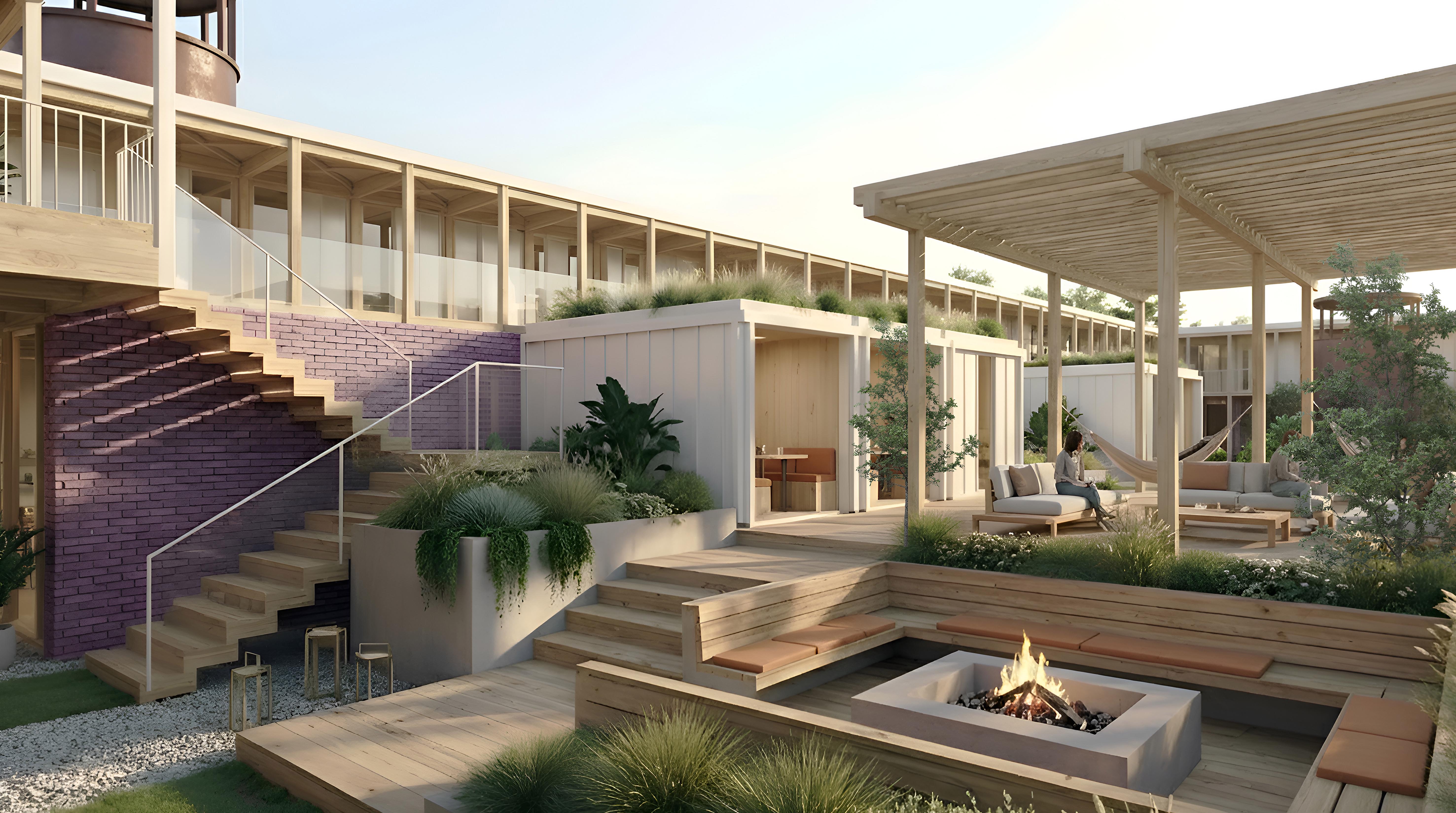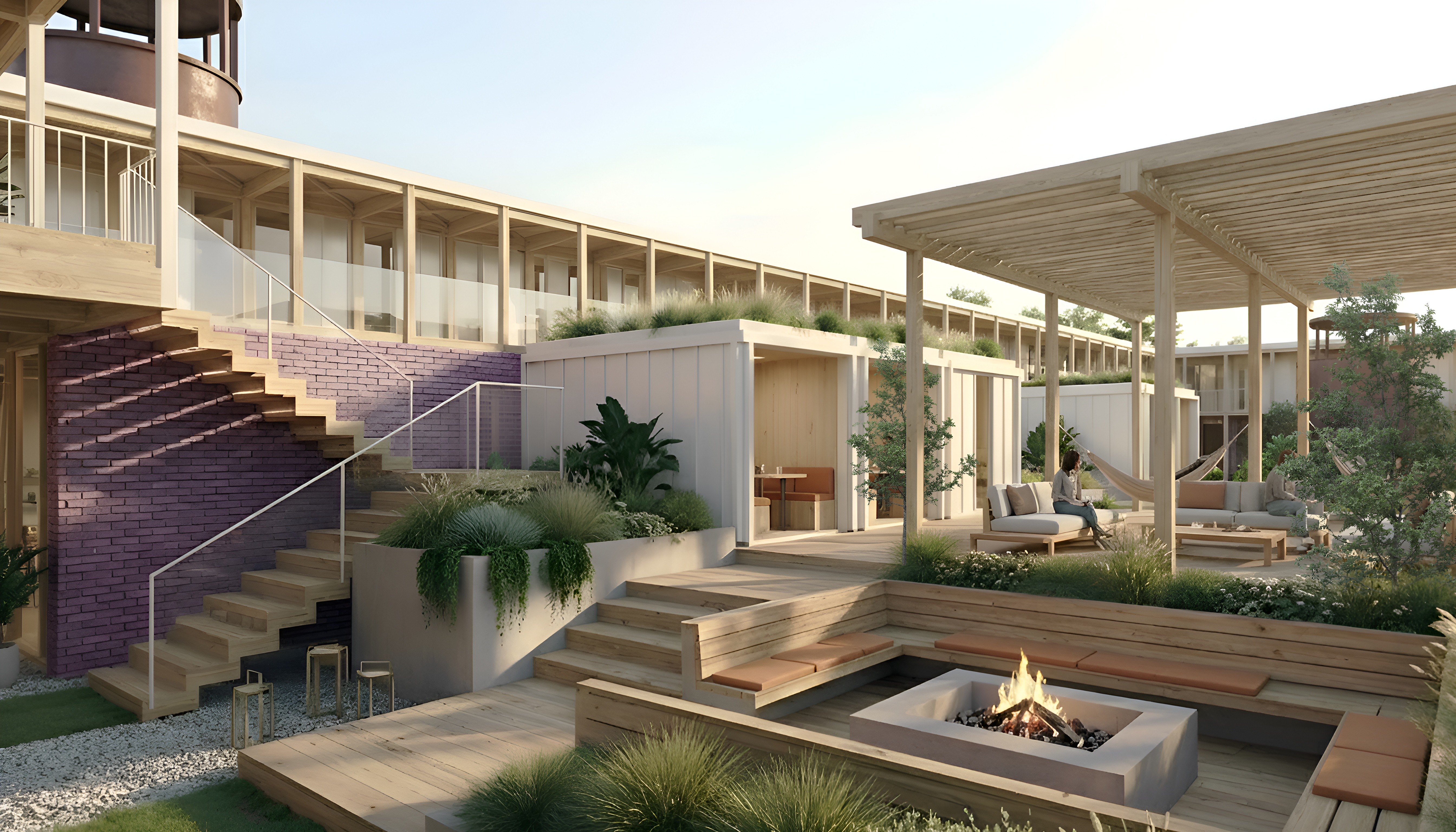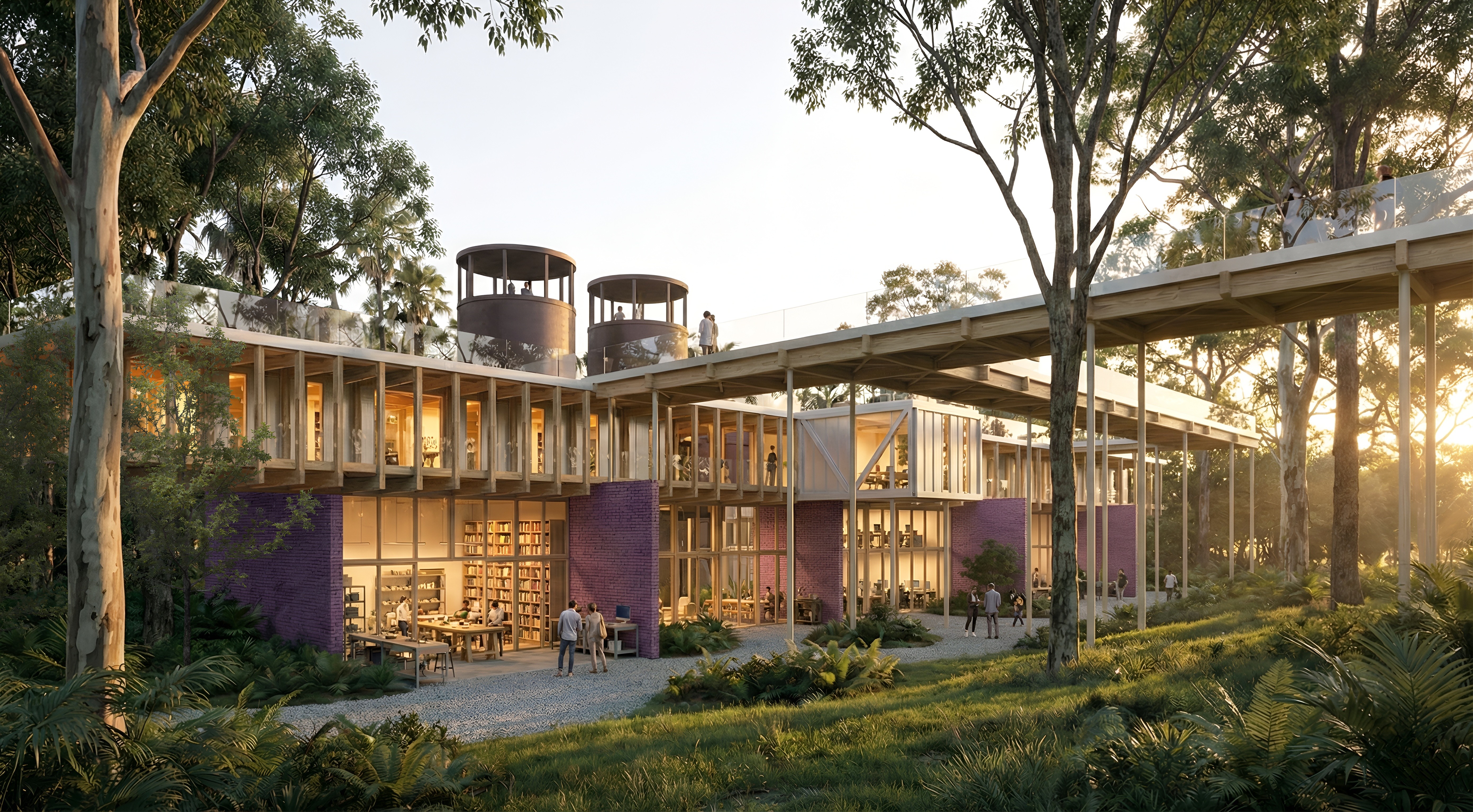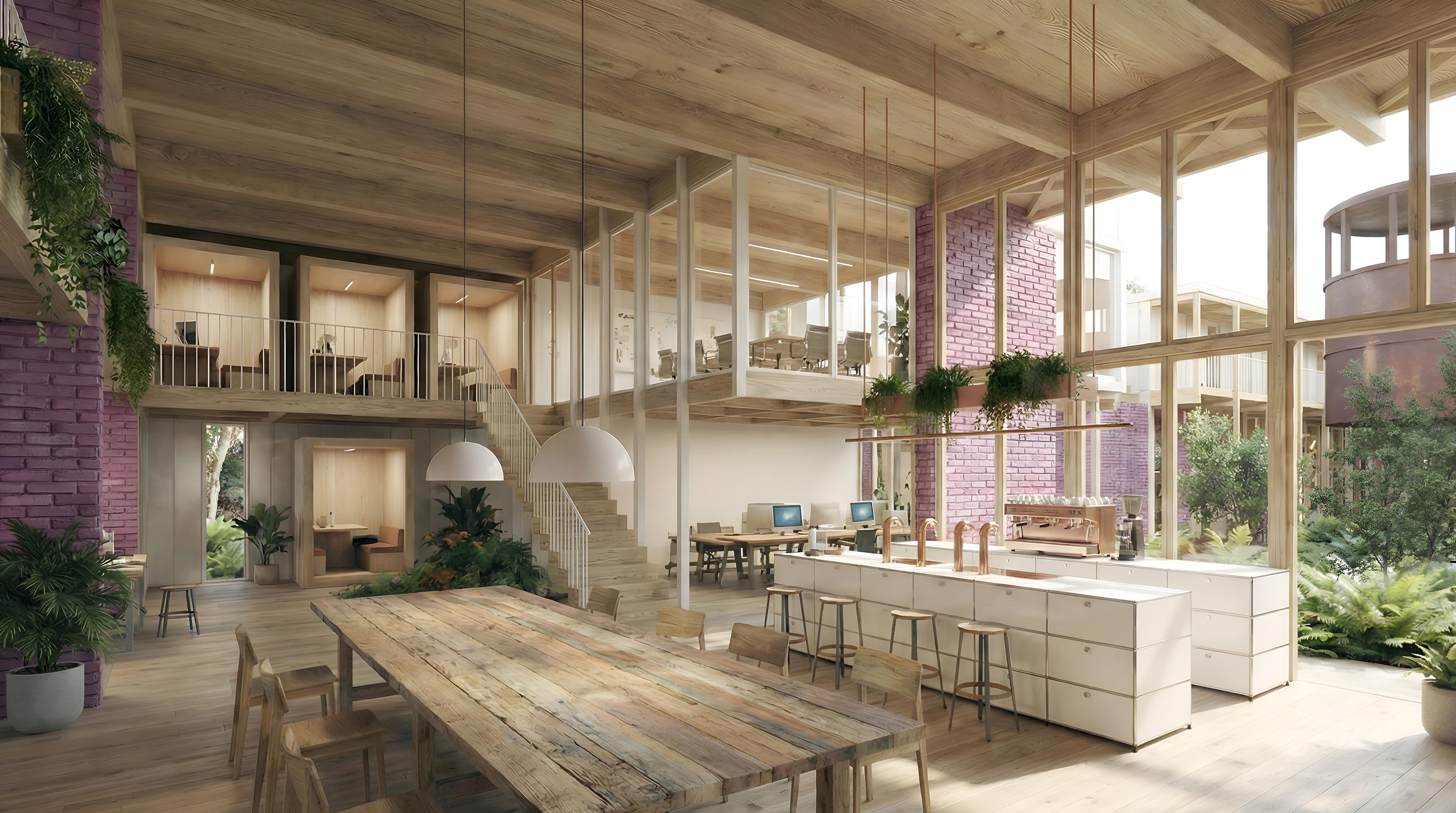Beyond its production role, the center establishes a calibrated interface between work, dwelling, and reflection without formalizing a residential program. Short-stay maker rooms, tool-maintenance bays, and shared hearth spaces are embedded at the edges of the working field, allowing prolonged engagement with the site while preserving its calmness. Light is treated as a working instrument—filtered, lateral, and heat-aware—entering through deep reveals, shaded clerestories, and partially open roofs to register daily and seasonal shifts. As a result, the architecture does not frame production as an event to be observed, but as a continuous condition to be inhabited, reinforcing Kaledran’s character as a place where making, waiting, and transformation unfold at their own pace.