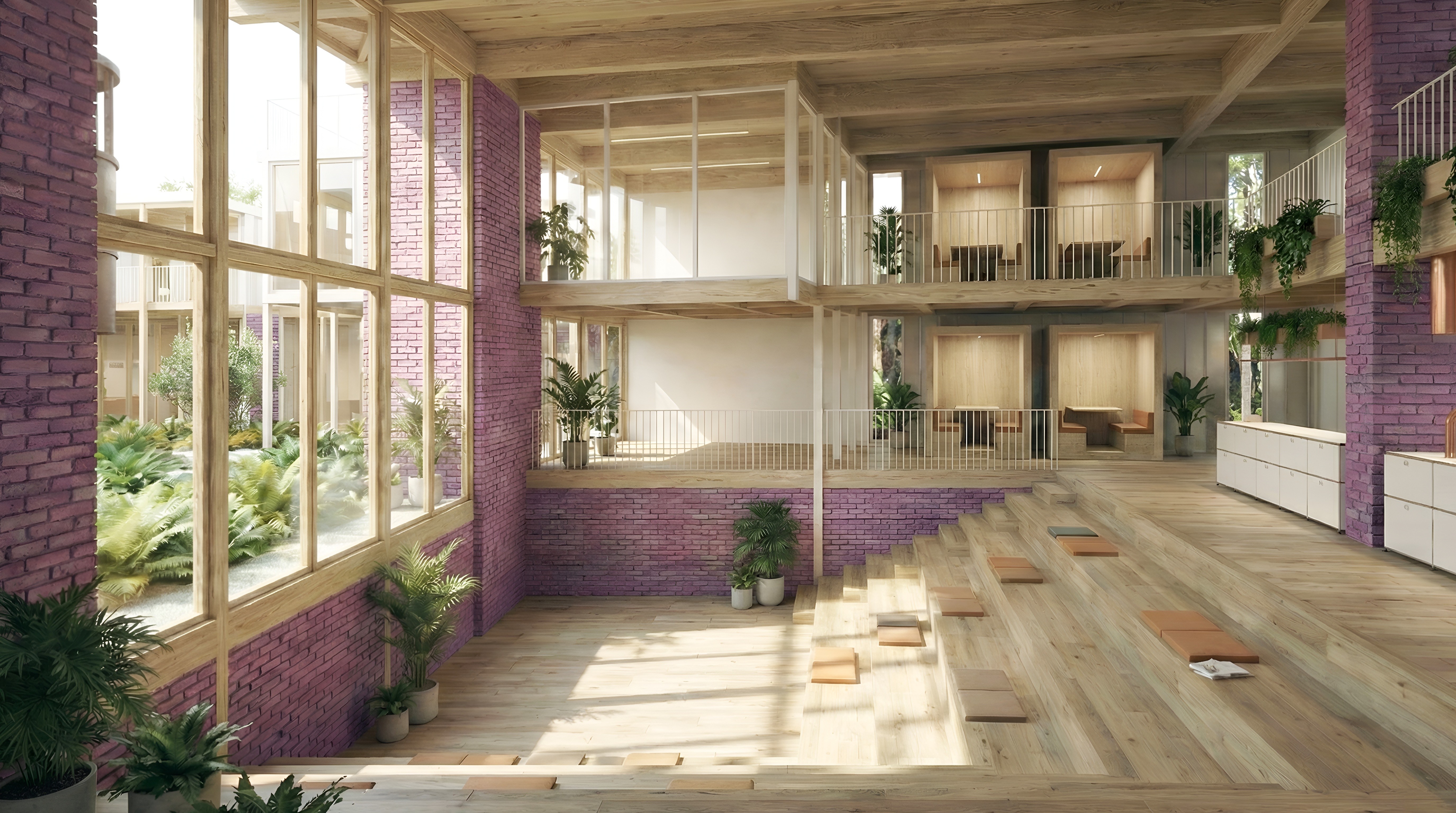 The architectural composition unfolds as a dispersed ensemble of low-rise volumes, calibrated to the scale of the village and aligned with existing topographic gradients and agricultural traces. Rather than a singular object, the center operates as a porous working field, where kilns, workshops, drying courts, material preparation spaces, and learning units are articulated as distinct yet interdependent structures. These elements are connected through shaded passages, semi-open galleries, and compressed thresholds that regulate light, heat, and airflow while mediating between interior production environments and the surrounding terrain.