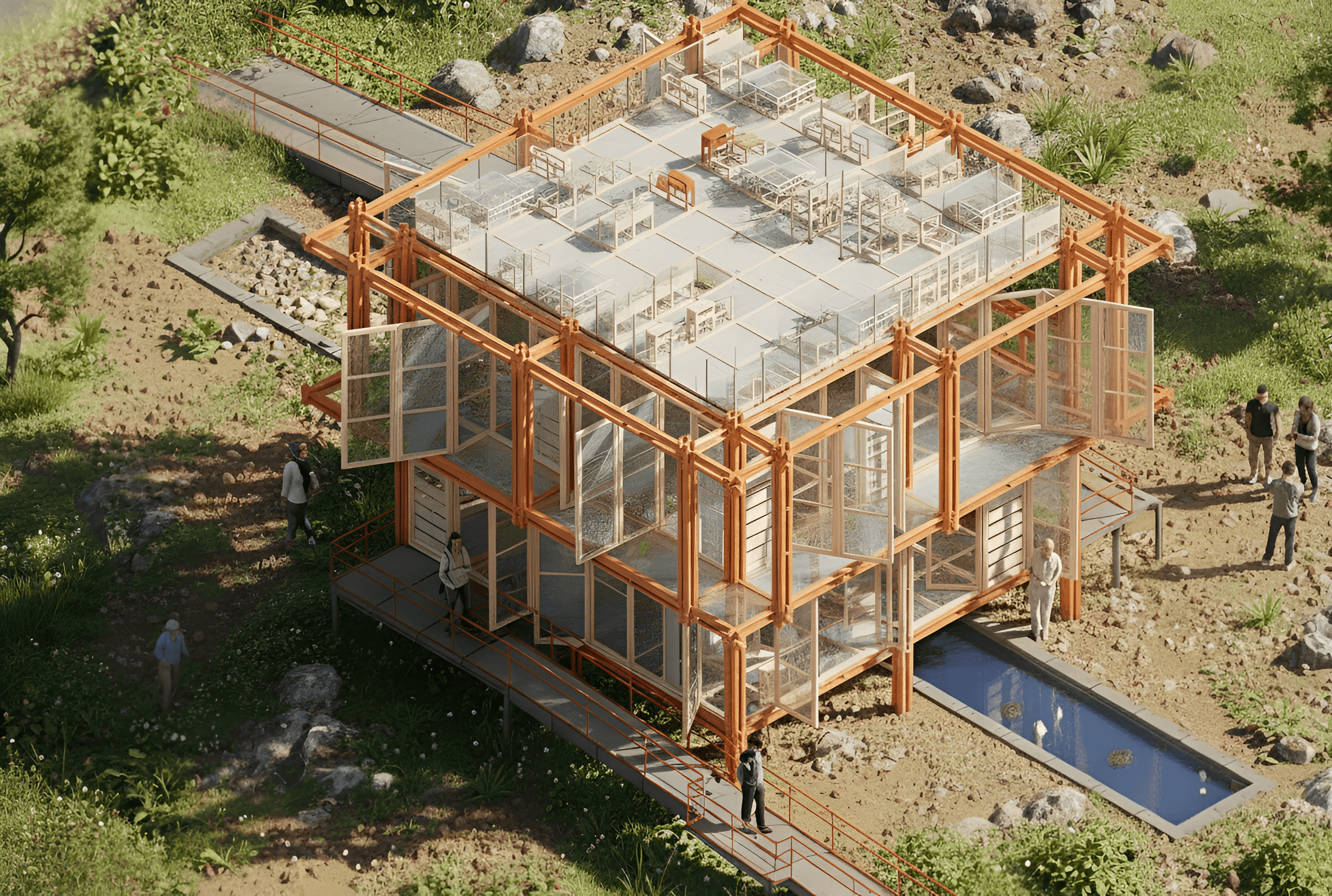 The design process began with a careful study of site conditions. Dense woodland encloses the western edge, while open meadows stretch toward the east. In response, the building adopts a long, narrow footprint aligned east to west — allowing for optimal daylighting and soft transitions between interior zones. Spaces are organized sequentially: the north-facing studio receives cool, even light ideal for painting, while the south-facing living space opens to a wooden terrace that catches afternoon sun and extends the interior into the surrounding field. Daily life follows the movement of light — from the quiet east-facing bedroom at sunrise to the golden shadows cast across the workspace at dusk.