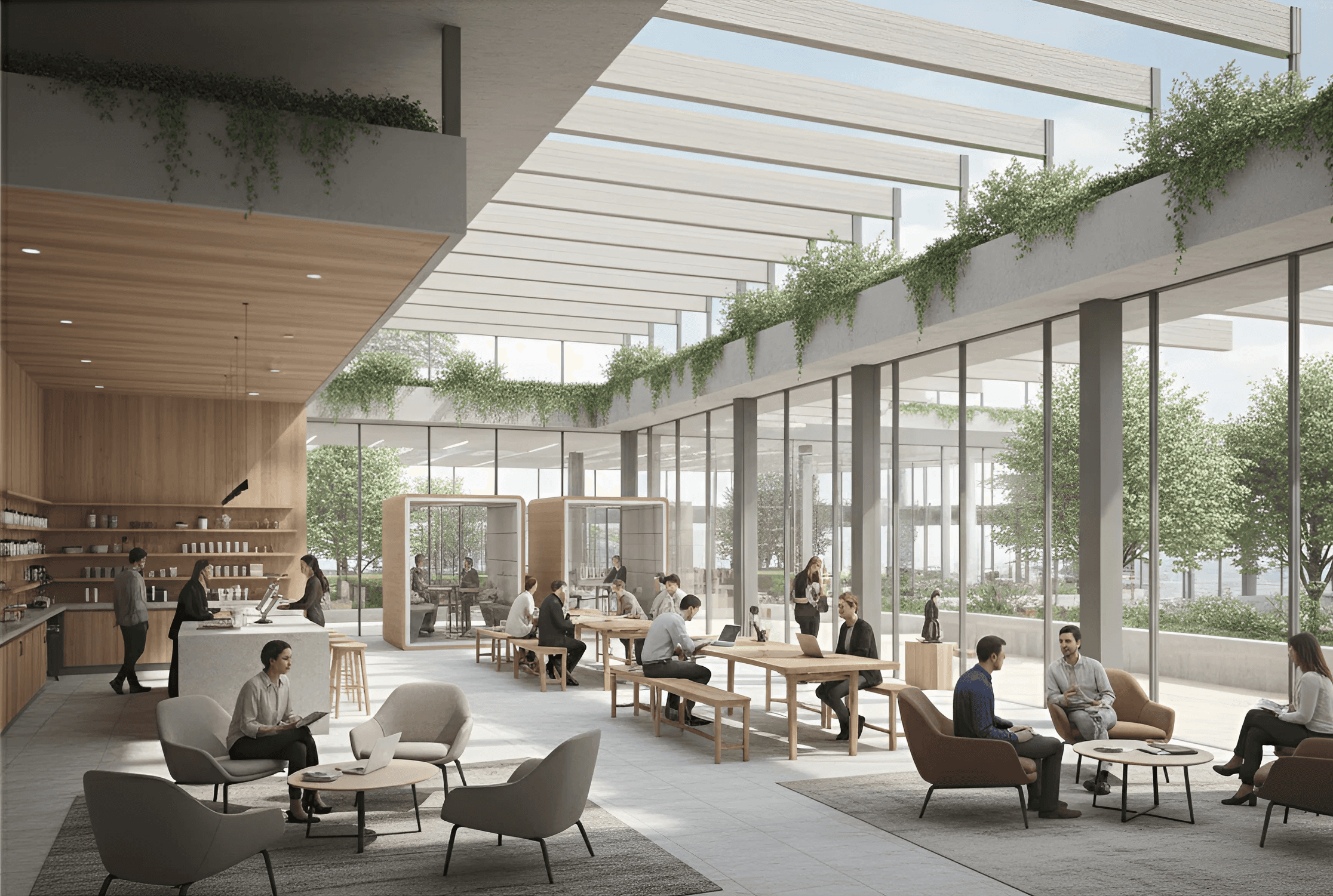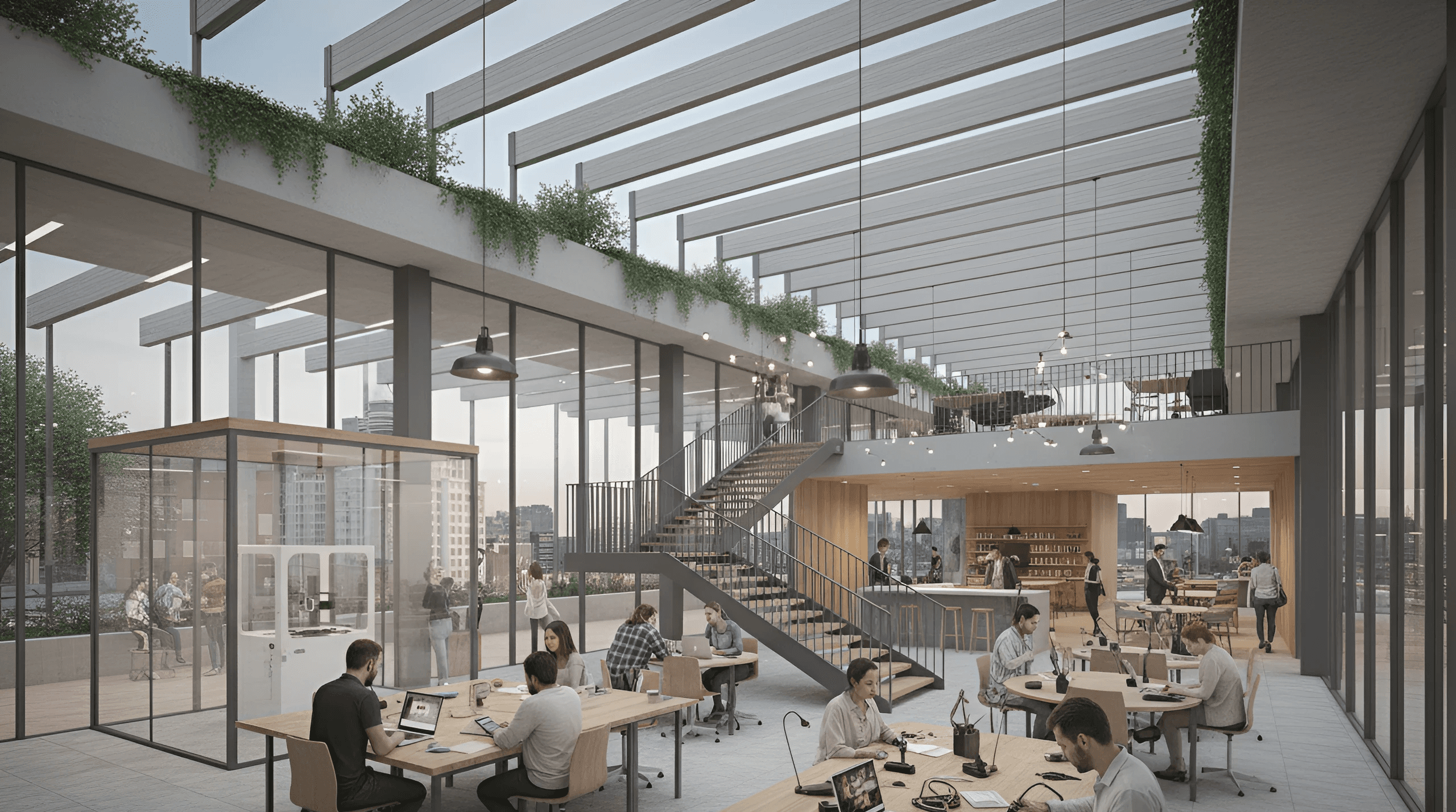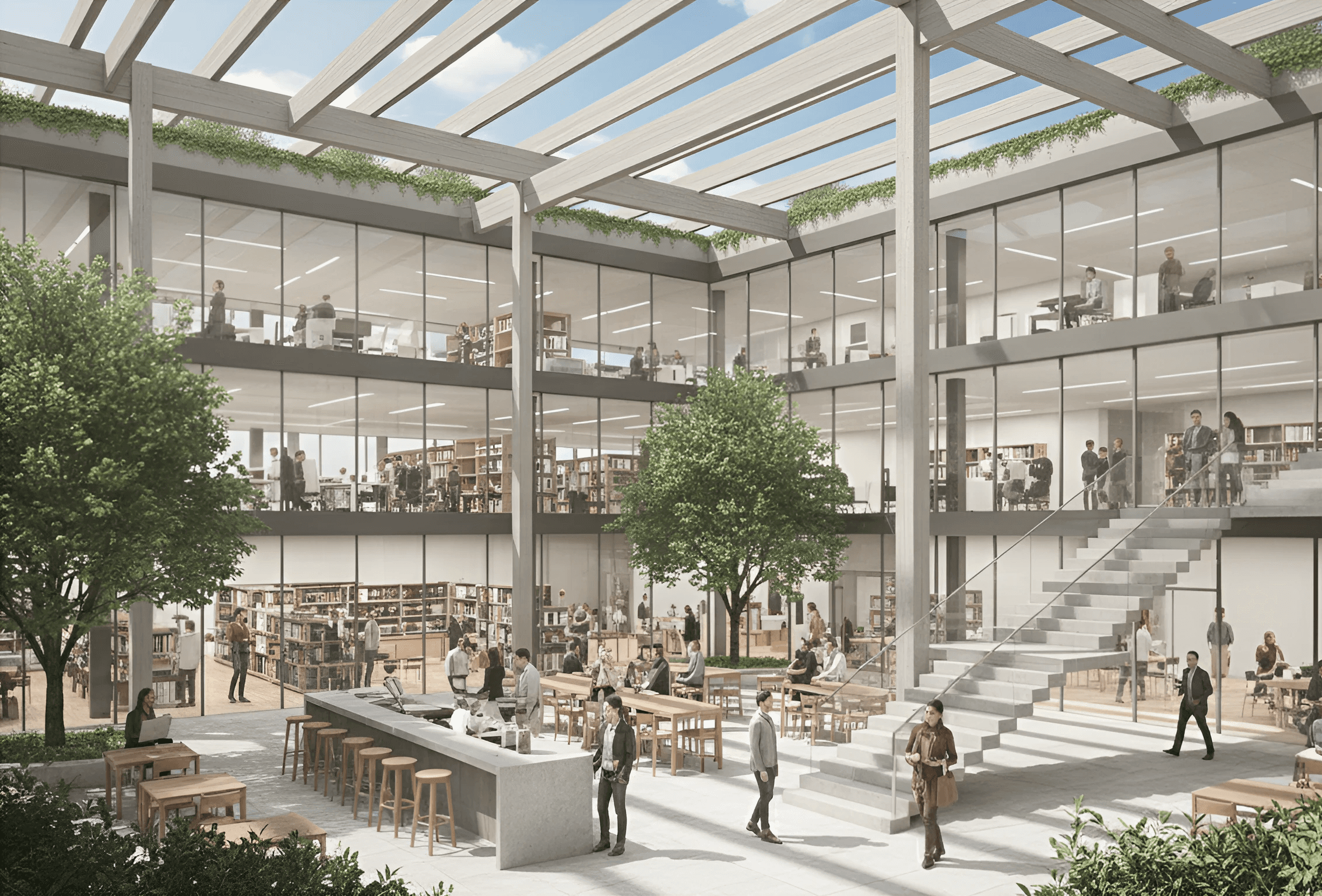 Inside, the cultural programs unfold around an atrium flooded with controlled daylight, filtered through a canopy of structural beams and greenery. The atrium acts as an interior plaza—part library, part co-working environment, part civic salon—where informal encounters and collaborative work generate new forms of public engagement. The material palette, defined by concrete, glass, and warm timber insertions, reinforces an atmosphere of institutional calm while supporting multiple modes of occupation. Lightweight enclosures, acoustic pods, open reading rooms, and generous stair-landings produce a gradient of spatial intensities, allowing citizens to choose how closely they wish to participate in the social life of the center. Inside, the cultural programs unfold around an atrium flooded with controlled daylight, filtered through a canopy of structural beams and greenery. The atrium acts as an interior plaza—part library, part co-working environment, part civic salon—where informal encounters and collaborative work generate new forms of public engagement. The material palette, defined by concrete, glass, and warm timber insertions, reinforces an atmosphere of institutional calm while supporting multiple modes of occupation. Lightweight enclosures, acoustic pods, open reading rooms, and generous stair-landings produce a gradient of spatial intensities, allowing citizens to choose how closely they wish to participate in the social life of the center.