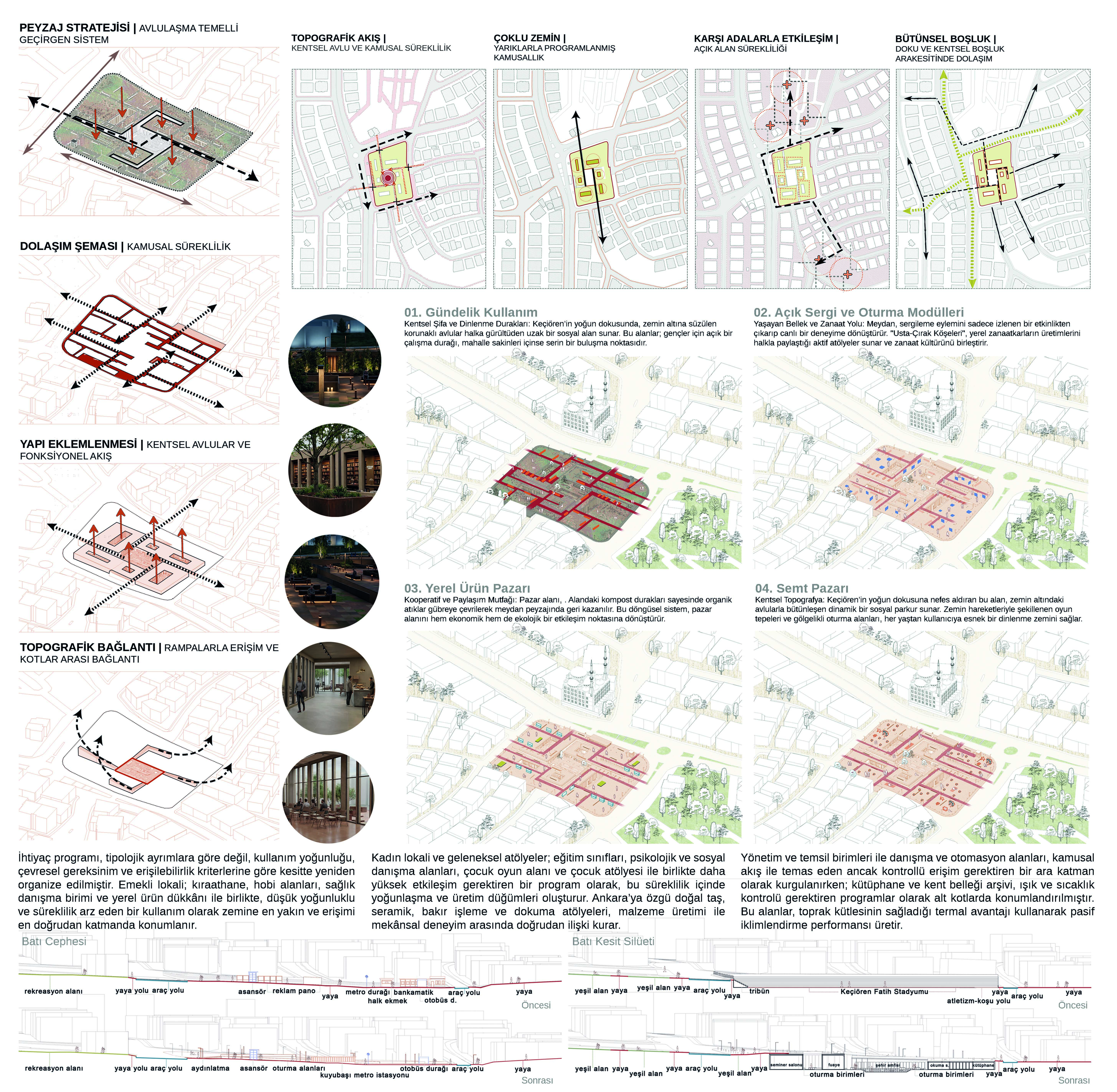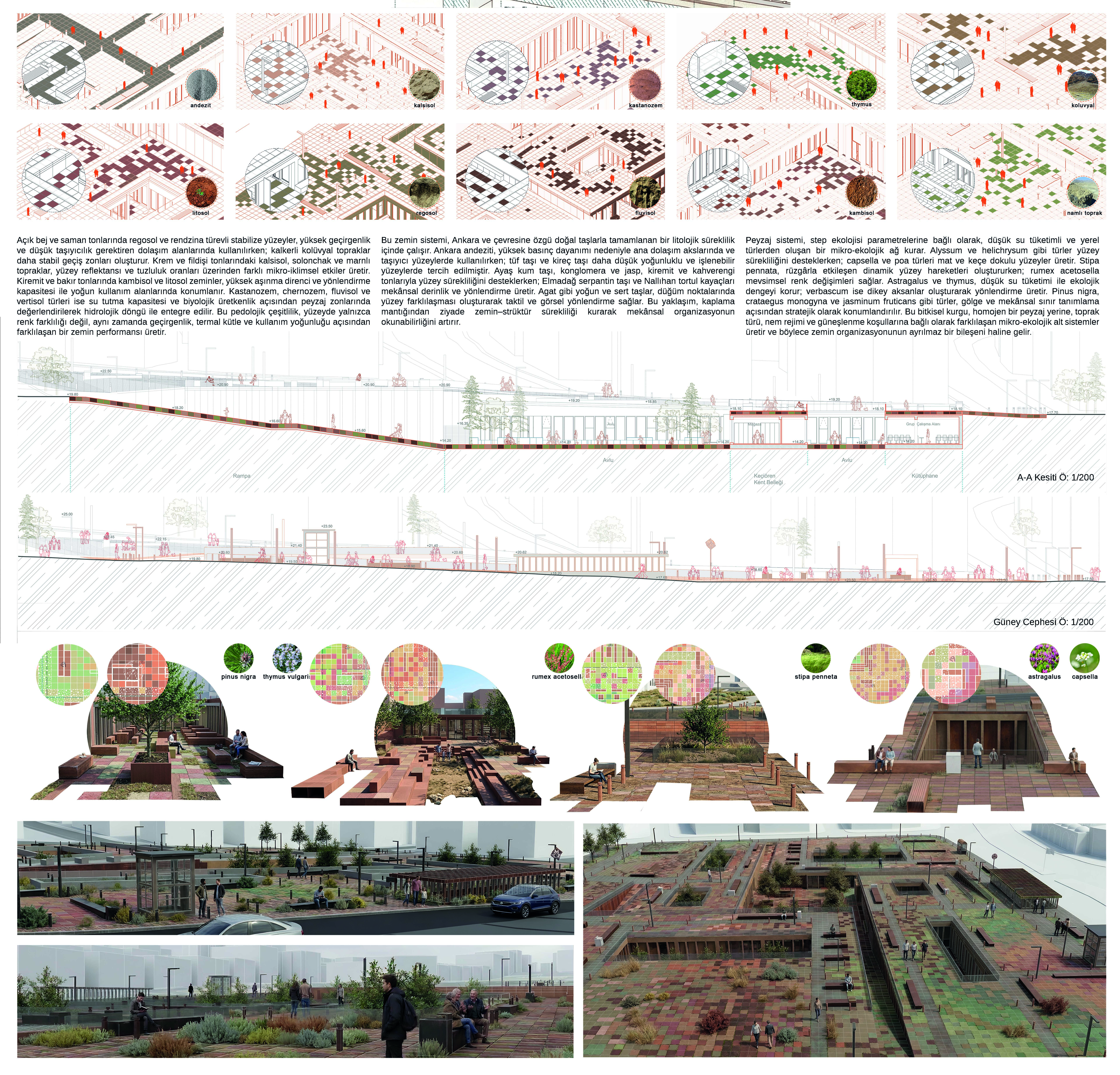 The Keçiören Fatih Stadium site, located in the northern part of Ankara, operates as a critical node where urban mobility intensifies and shifts direction along a strong transportation spine. Its direct relationship with the Kuyubaşı Metro station transforms the area into a transitional interface rather than a fixed destination. In this proposal, the site is not approached as a static planimetric problem, but as a sedimentary field condition. This perspective foregrounds the coexistence and interaction of multiple layers, including pedological (ground), geological (structural), hydrological (water flows), and socio-cultural strata. The sedimentary approach constructs a permeable urban fabric through the superposition of layers with varying densities and performance capacities. The project is therefore developed through a sectional continuity rather than a purely planar organization. The ground is redefined not as a flat surface, but as a relational field shaped by horizontal, vertical, and temporal interactions. Topographical variations, hydrological flows, and programmatic intensities collectively inform the spatial morphology of the site.