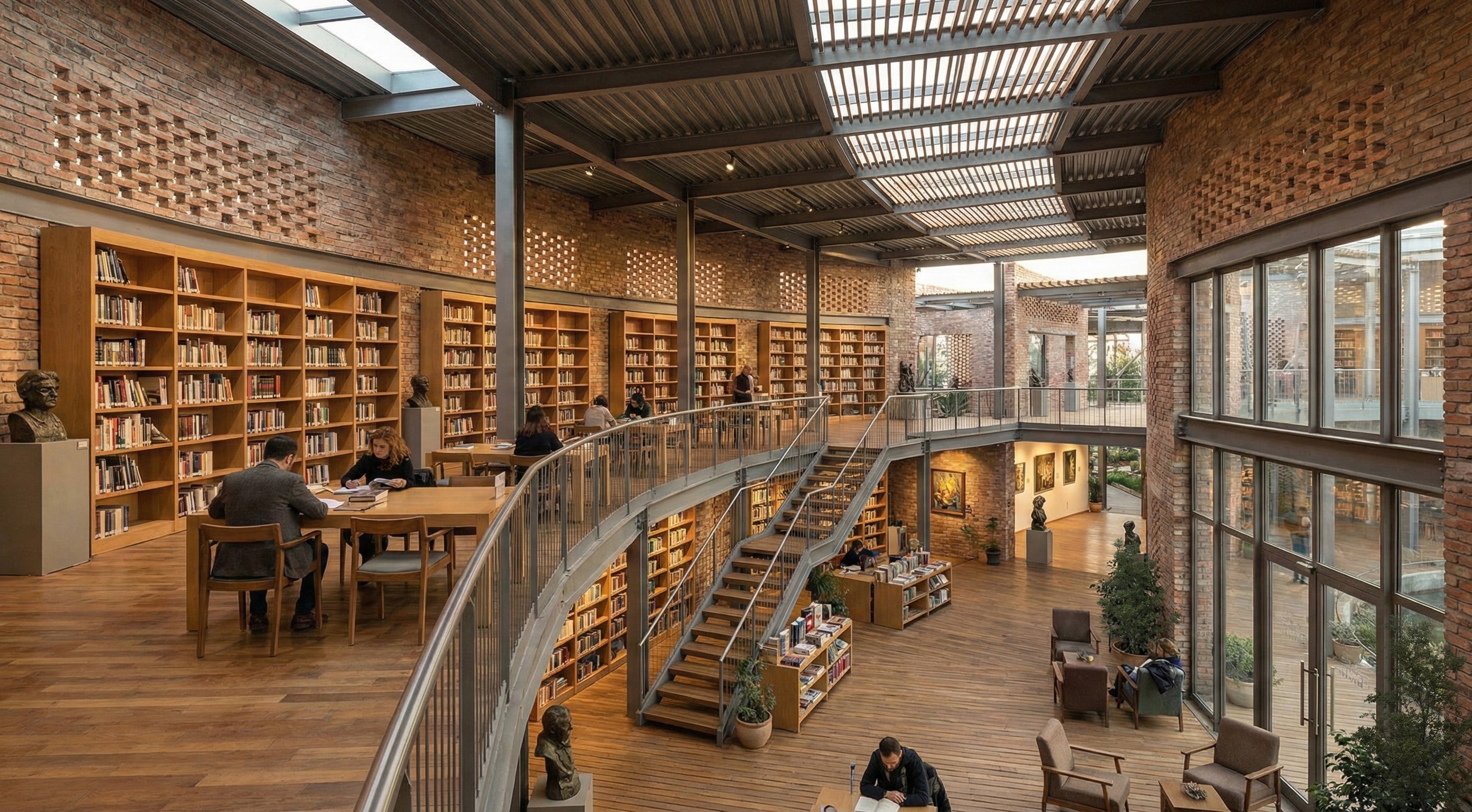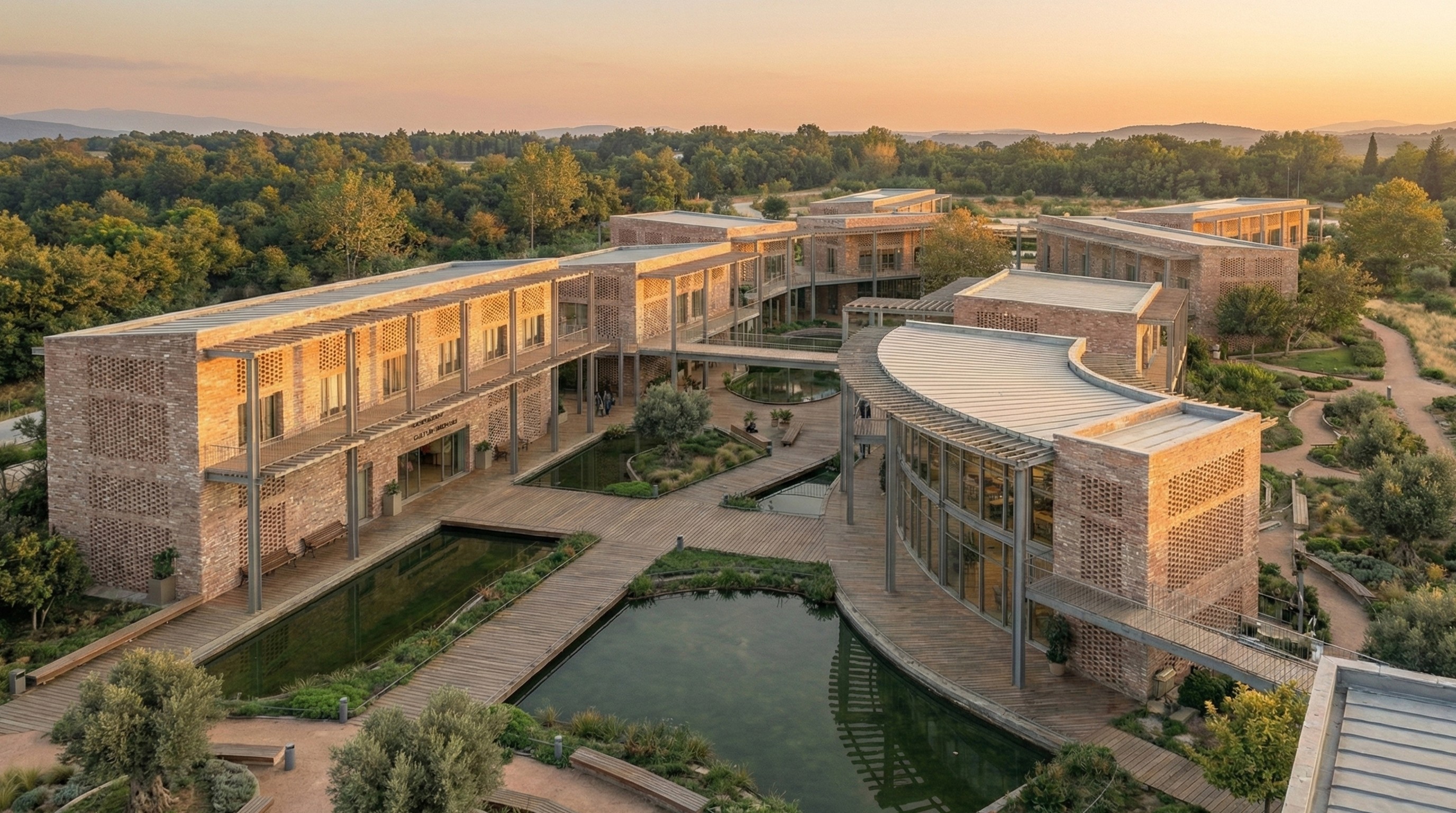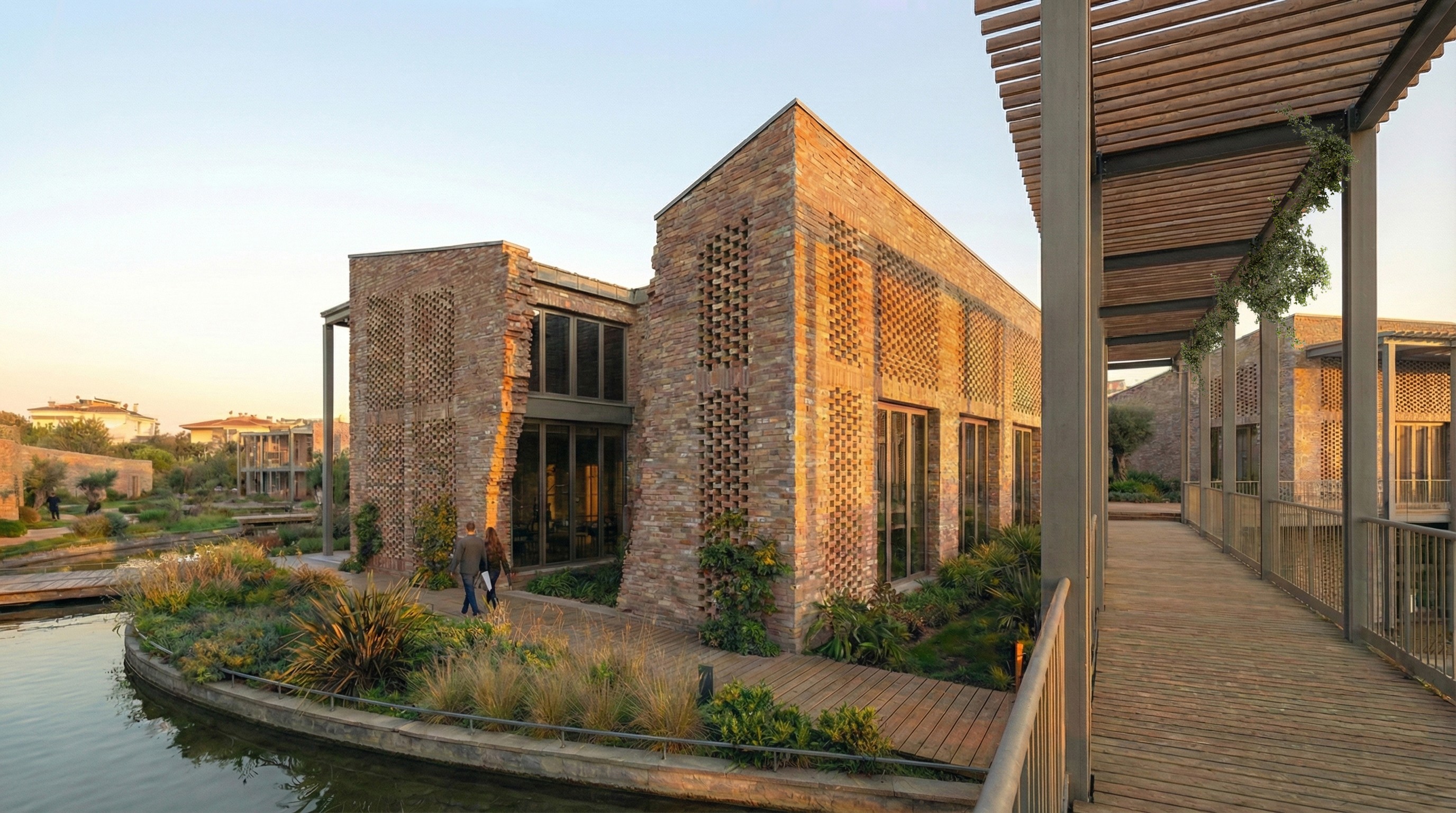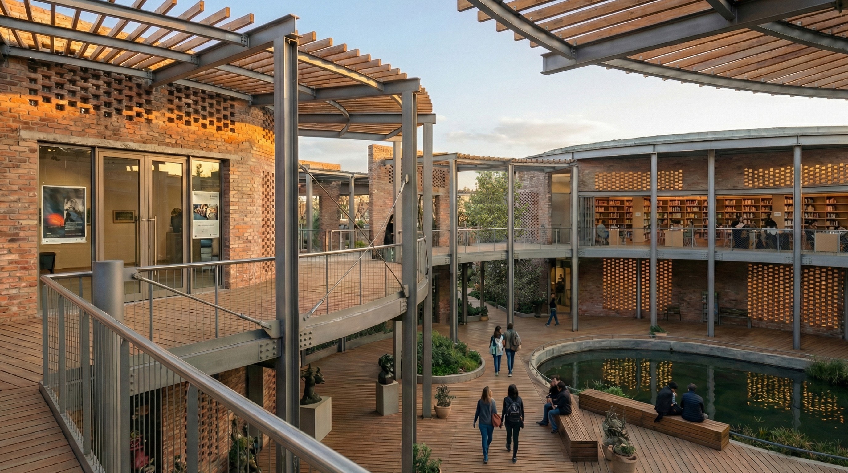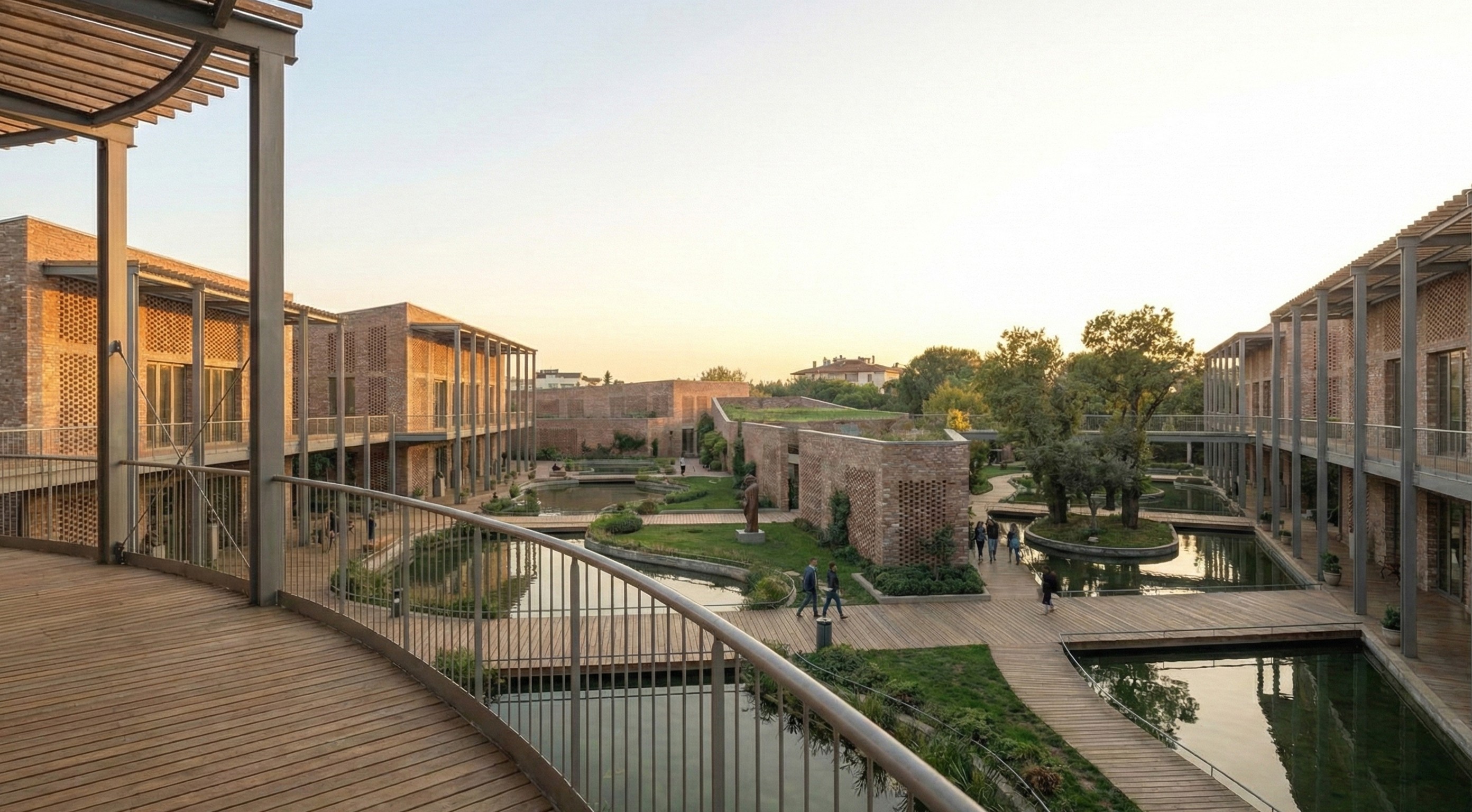 Environmental performance is embedded within the spatial and material organization of the campus extension. Courtyards operate as microclimatic moderators, supporting natural ventilation, daylight control, and seasonal adaptability. Shaded walkways, planted surfaces, and permeable edges contribute to passive comfort strategies while reinforcing the campus’s ecological framework. Architecture and landscape function as a single environmental system, where spatial configuration supports both academic use and long-term resilience.
